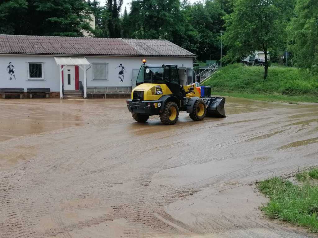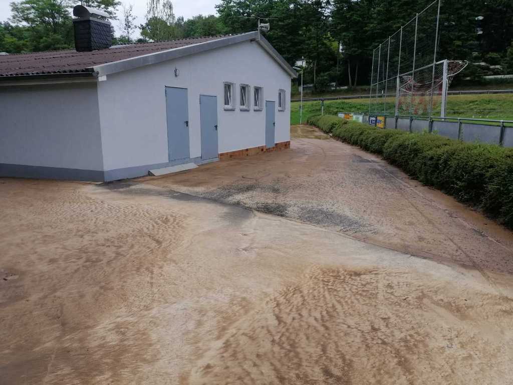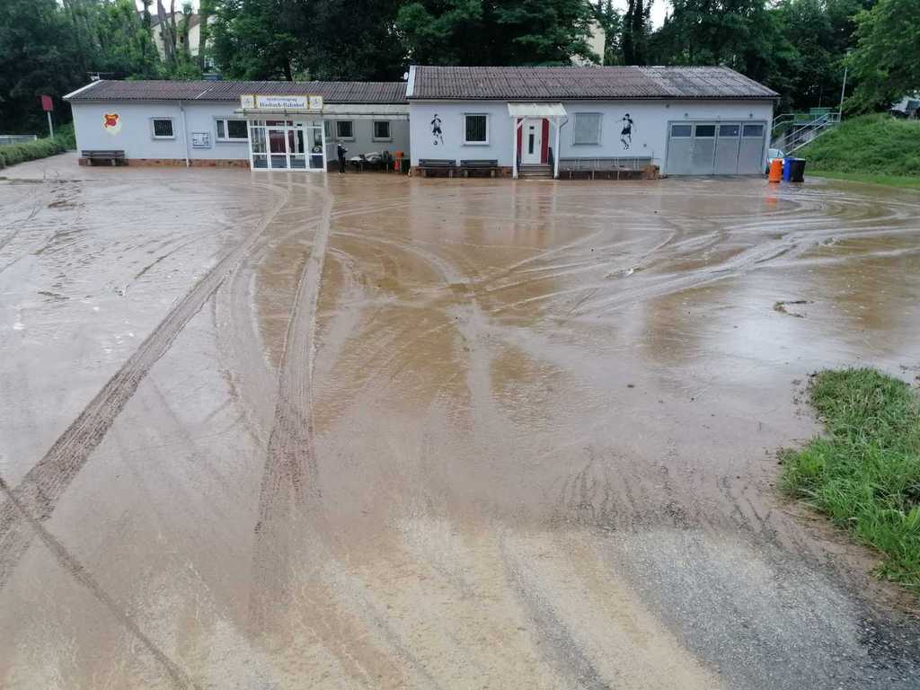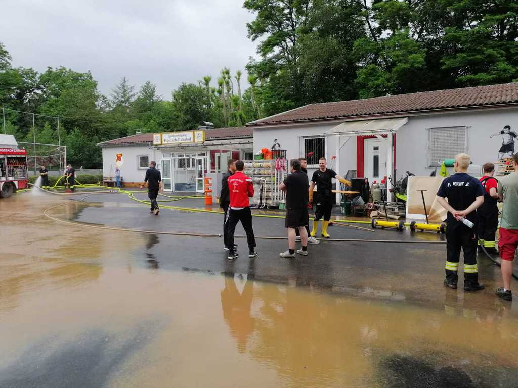 Heftige Gewitter und Starkregen sorgten in der Nacht auf Sonntag gebietsweise für schlaflose Nächte der vielen fleißigen Einsatzkräfte. Nach üblen Hochwassererfahrungen in den letzten Jahren waren auch in der vergangenen Nacht unsere Gedanken wieder bei unserem "Wohnzimmer", als Feuerwehrkommandant Christian Prakesch der Freiwilligen Feuerwehr Hösbach Bahnhof uns telefonisch über den Einsatz am Vereinsgelände informierte. Heftige Schlammlawinen überschwemmten Parkplatz, Garage, Fußwege und Teile des oberen Sportplatzes. Die zähen Schlammmassen "klebten" überall und mussten mit Bagger, viel Wasser und jeder Menge Einsatz der Helfer vom Boden gekratzt werden. Wir möchten uns ganz besonders bei der Freiwilligen Feuerwehr Hösbach Bahnhof und dem Bauhof der Marktgemeinde Hösbach für Ihren unermüdlichen Einsatz in der Nacht und während den Aufräumarbeiten am Sonntag bedanken. Ein weiteres sehr großes Dankeschön geht an die Firma Werotec, die spontan vorbei gekommen sind um uns mit Bautrocknern auszuhelfen. Den vielen weiteren fleißigen Helfern gilt ein genauso großes Dankeschön, das von ganzen Herzen kommt! Das war grandios von euch allen und überwältigend für uns zu sehen! Die Bahnhöfer haben mal wieder gezeigt, wie wir zusammen stehen, zusammen halten und auch das wieder gemeinsam schaffen. DANKE!